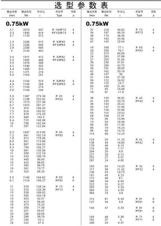 選型參數表0.75kW(續)